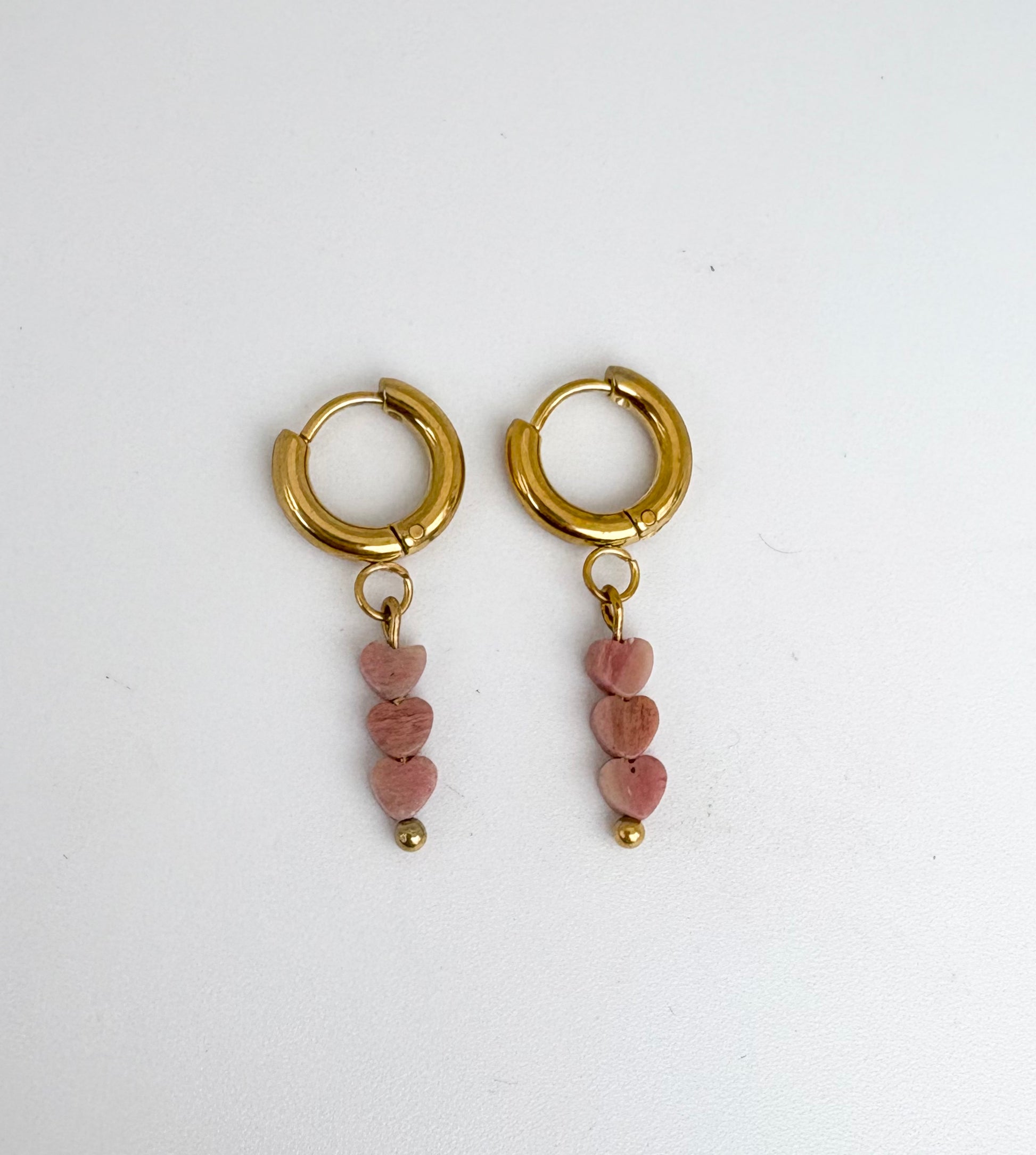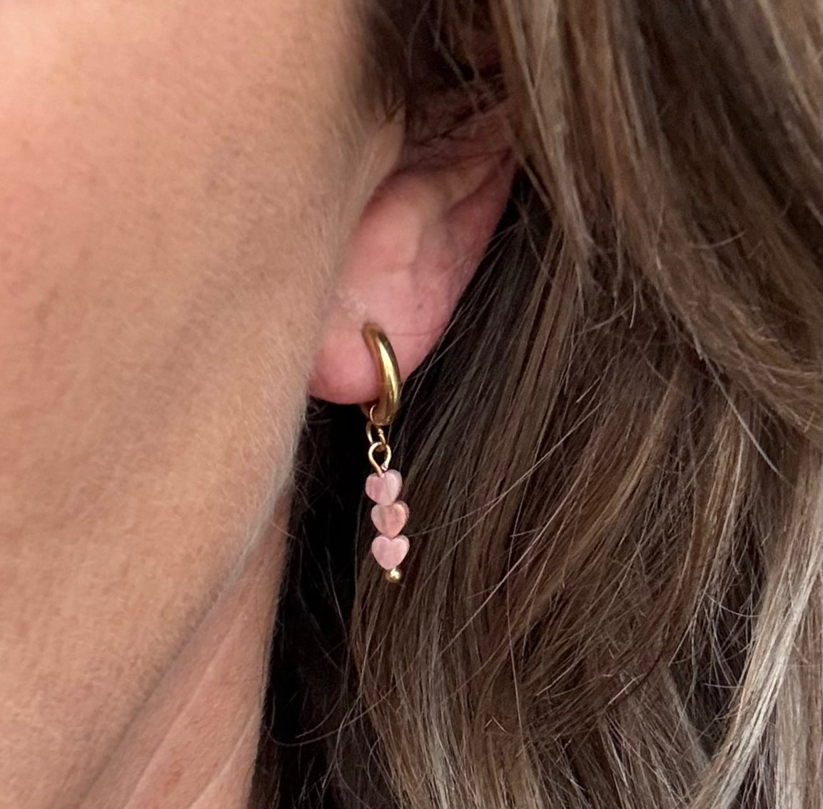 Setje stainless steel oorringetjes met roze natuursteen hartjes. Het zijn kleine oorringetjes : ong. 11mm en dikte ong.2mm.