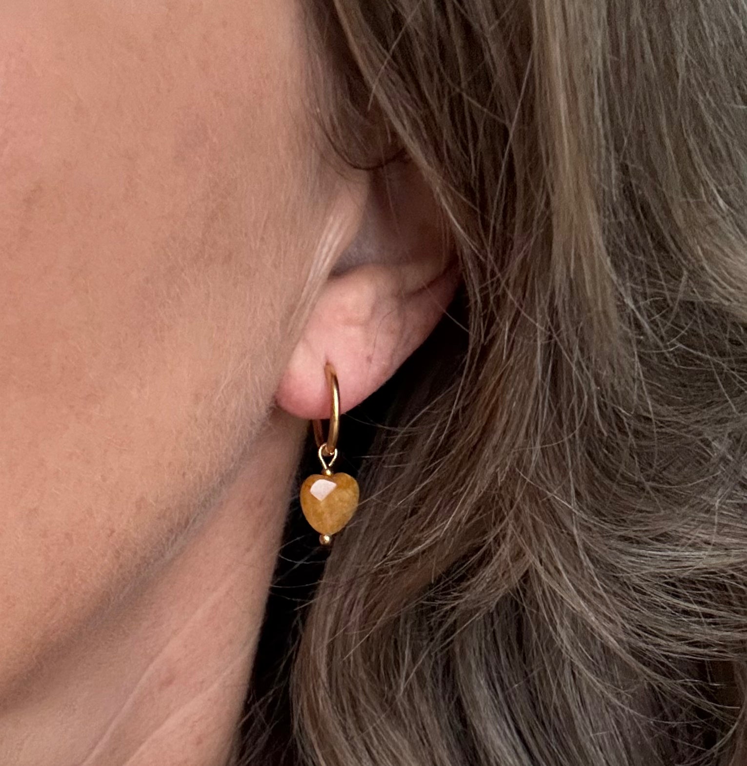 Setje stainless steel gouden oorbellen (15mm) met amber hartje.