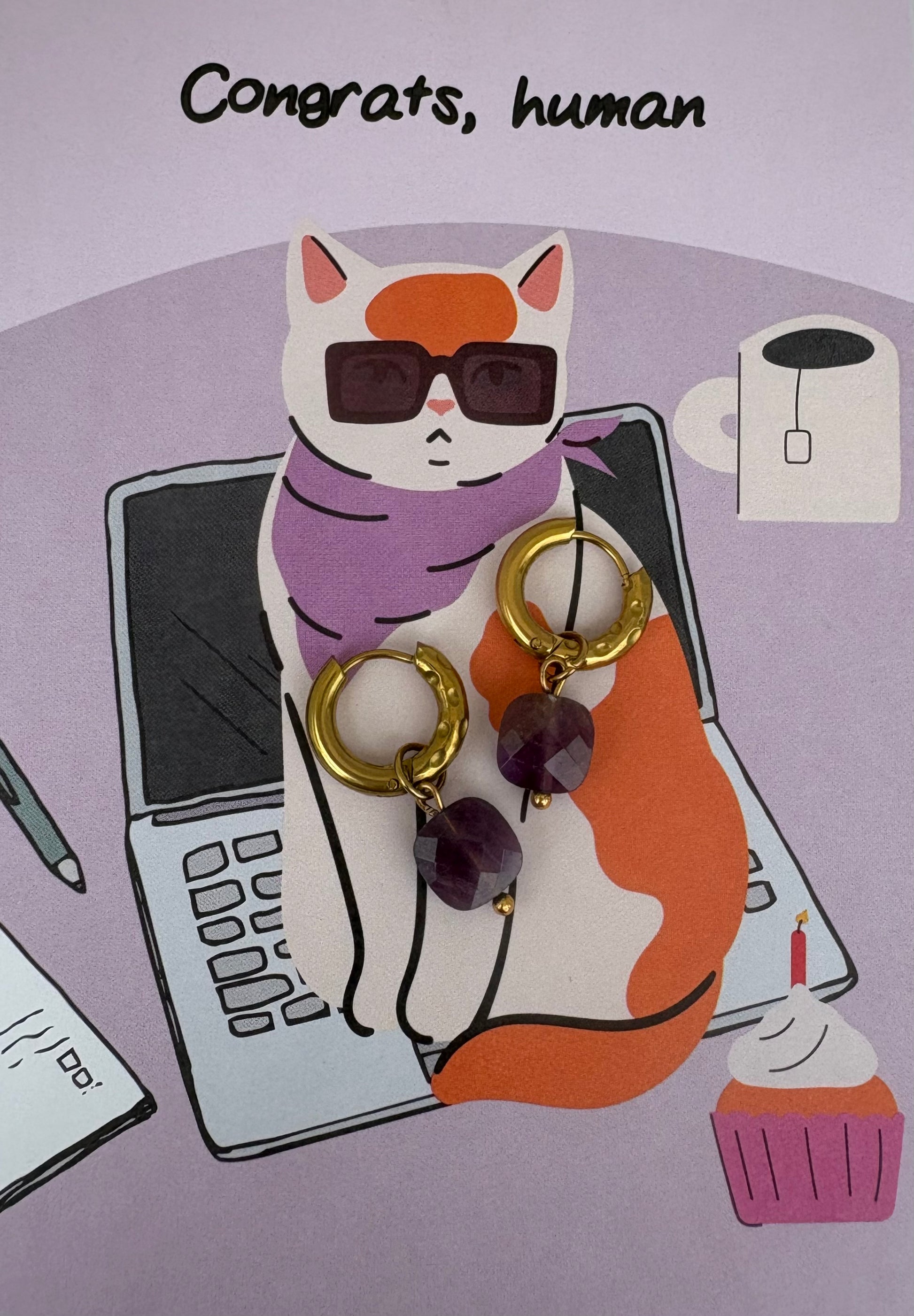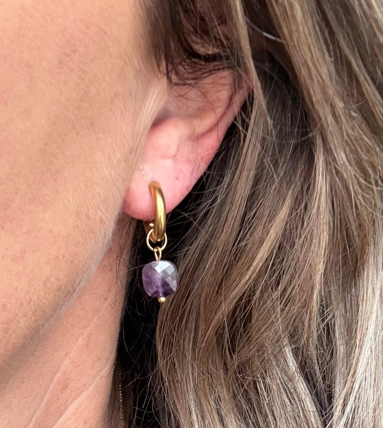 Setje stainless steel gouden oorbellen met mooie geslepen amethyst steentjes. Geen enkele natuursteen is hetzelfde, dus de kleur kan per stuk ietsje verschillen in licht en donker. Dikte ringetjes is ong 2,5-3mm en grootte ong.15mm.
