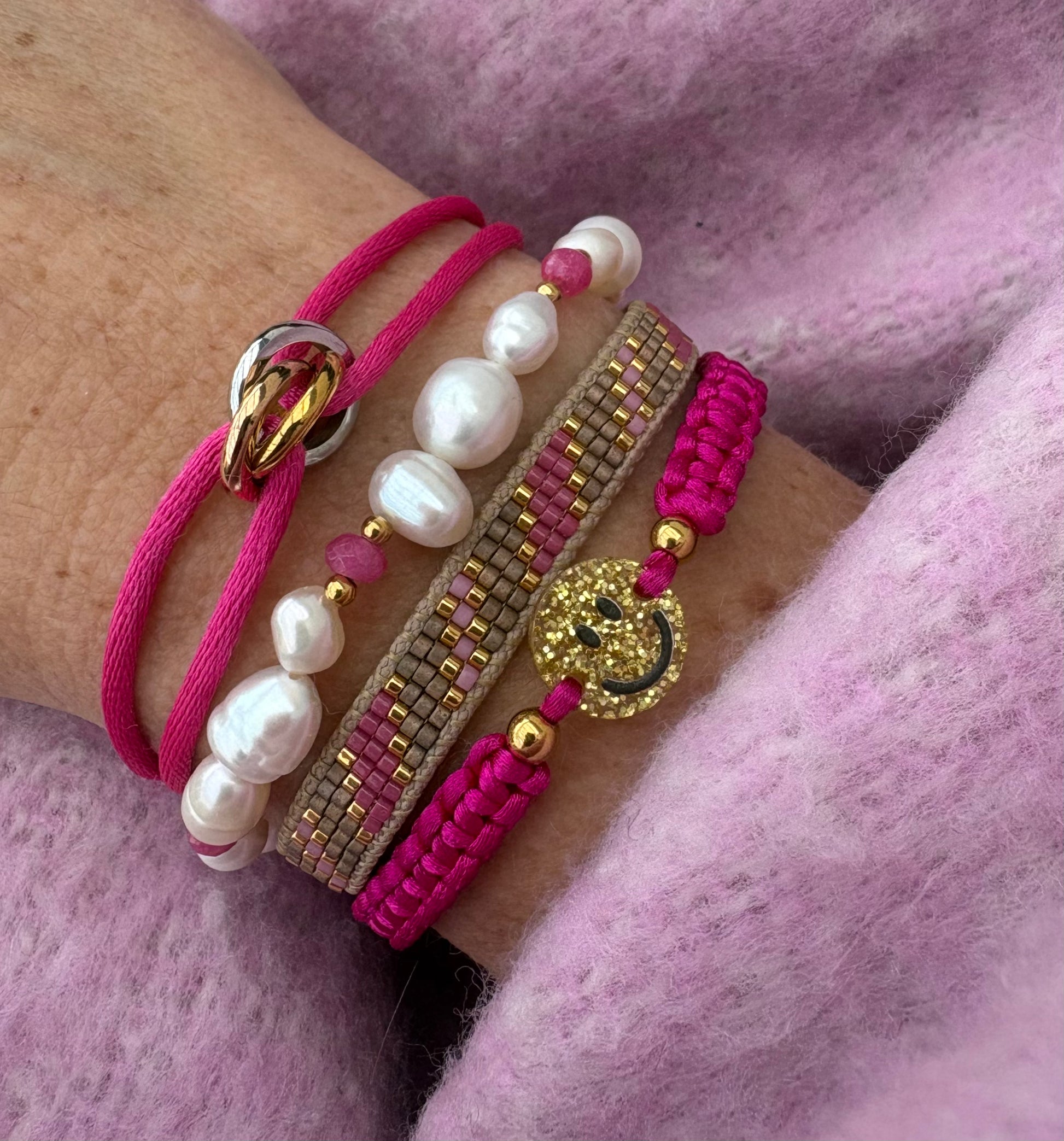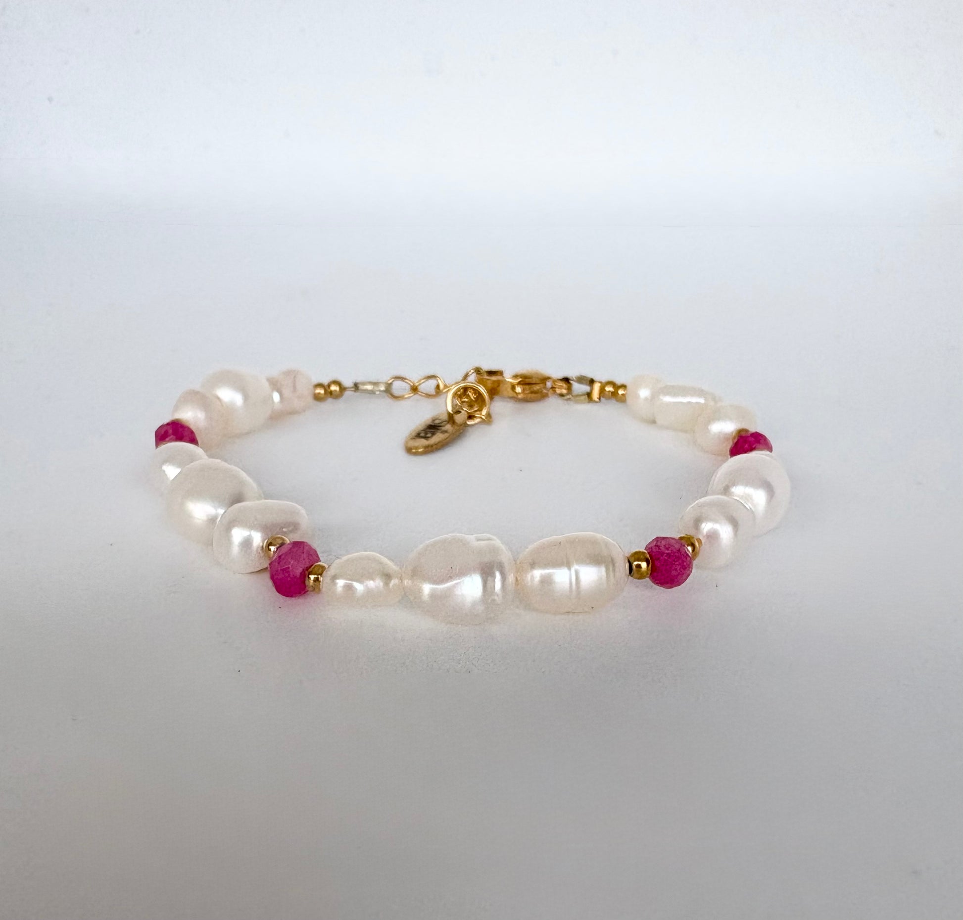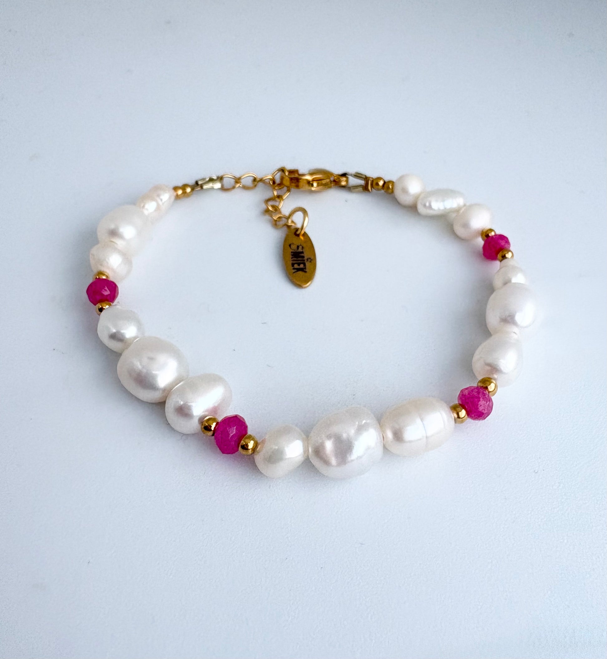 Armband met verschillende maten parels en roze details. Lengte is ong.16cm en 3cm verlengketting.