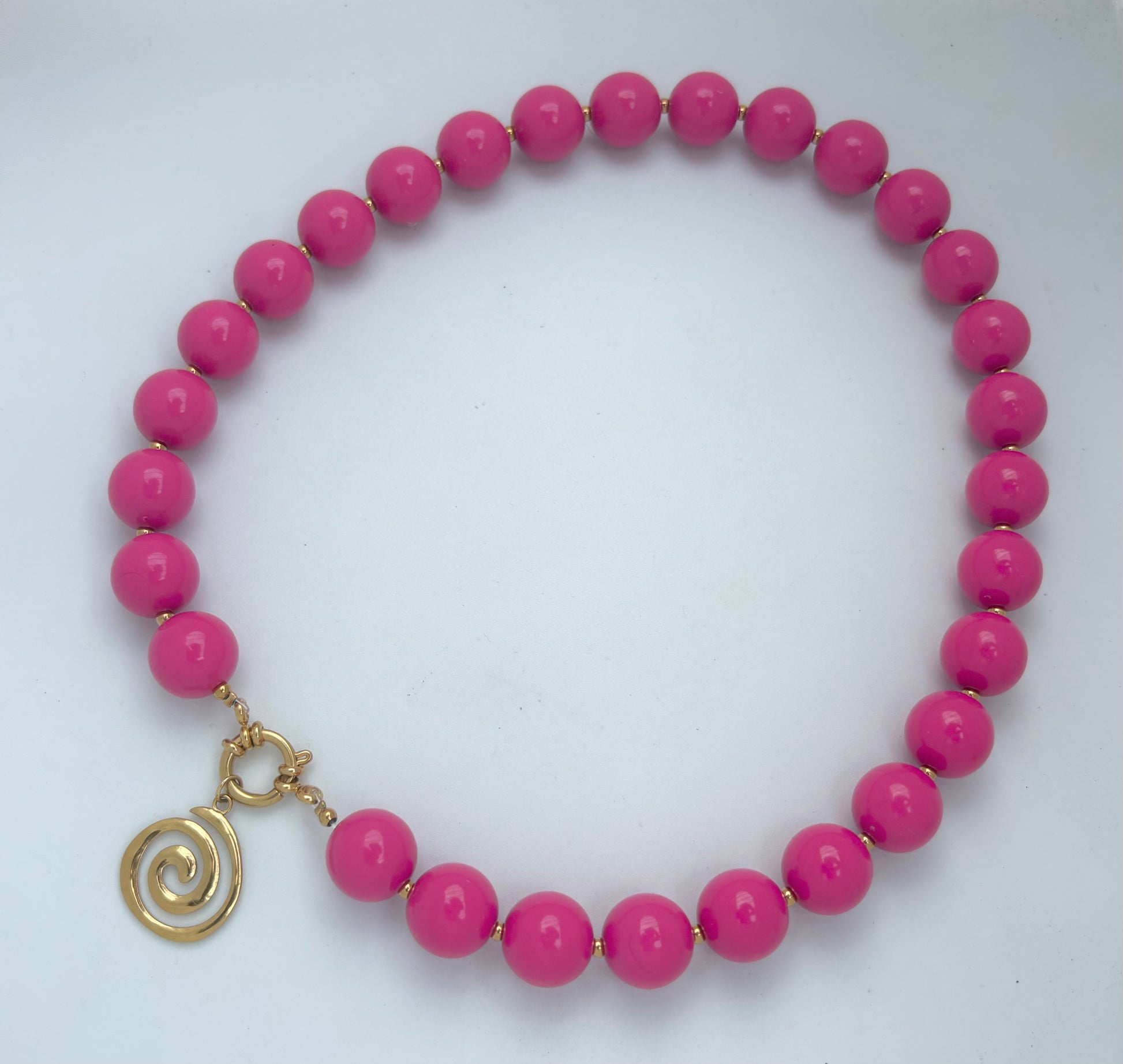 Ketting met lengte van 46,5cm, kleurvaste plastic kralen en stainless steel gouden details. De swirl is er makkelijk om en af te haken, voor als je meer zin hebt in een basic ketting.