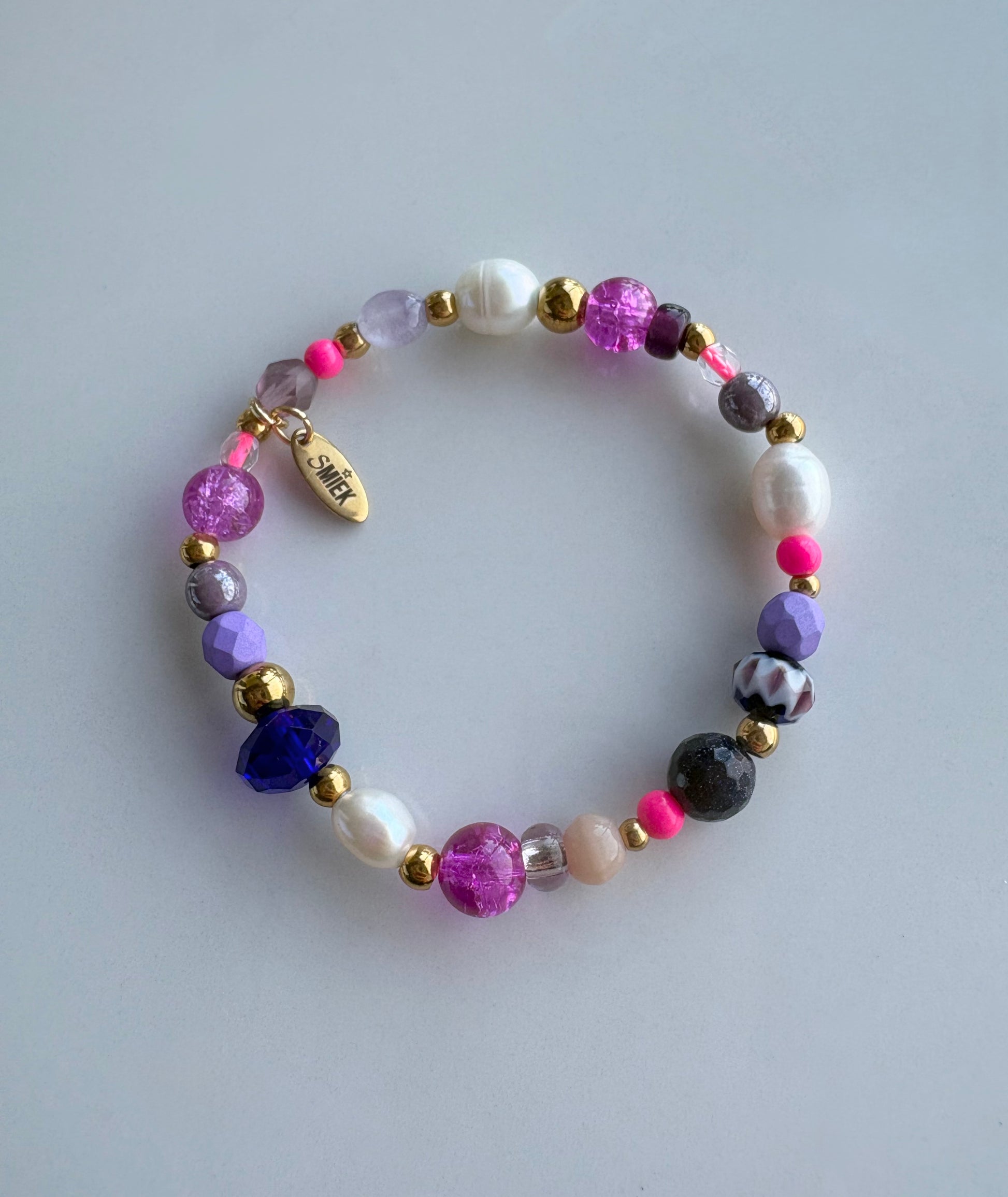 Armband geregen op elastiek met glaskralen, parels en stainless steel gouden details. Geschikt voor de smalle tot gemiddelde pols. (Breedte ong.17)