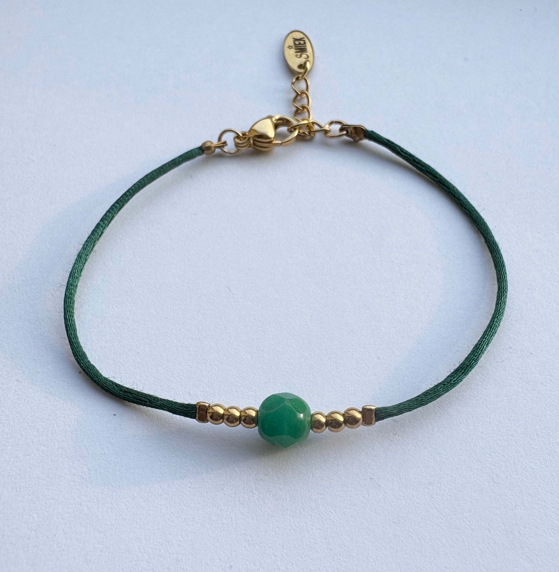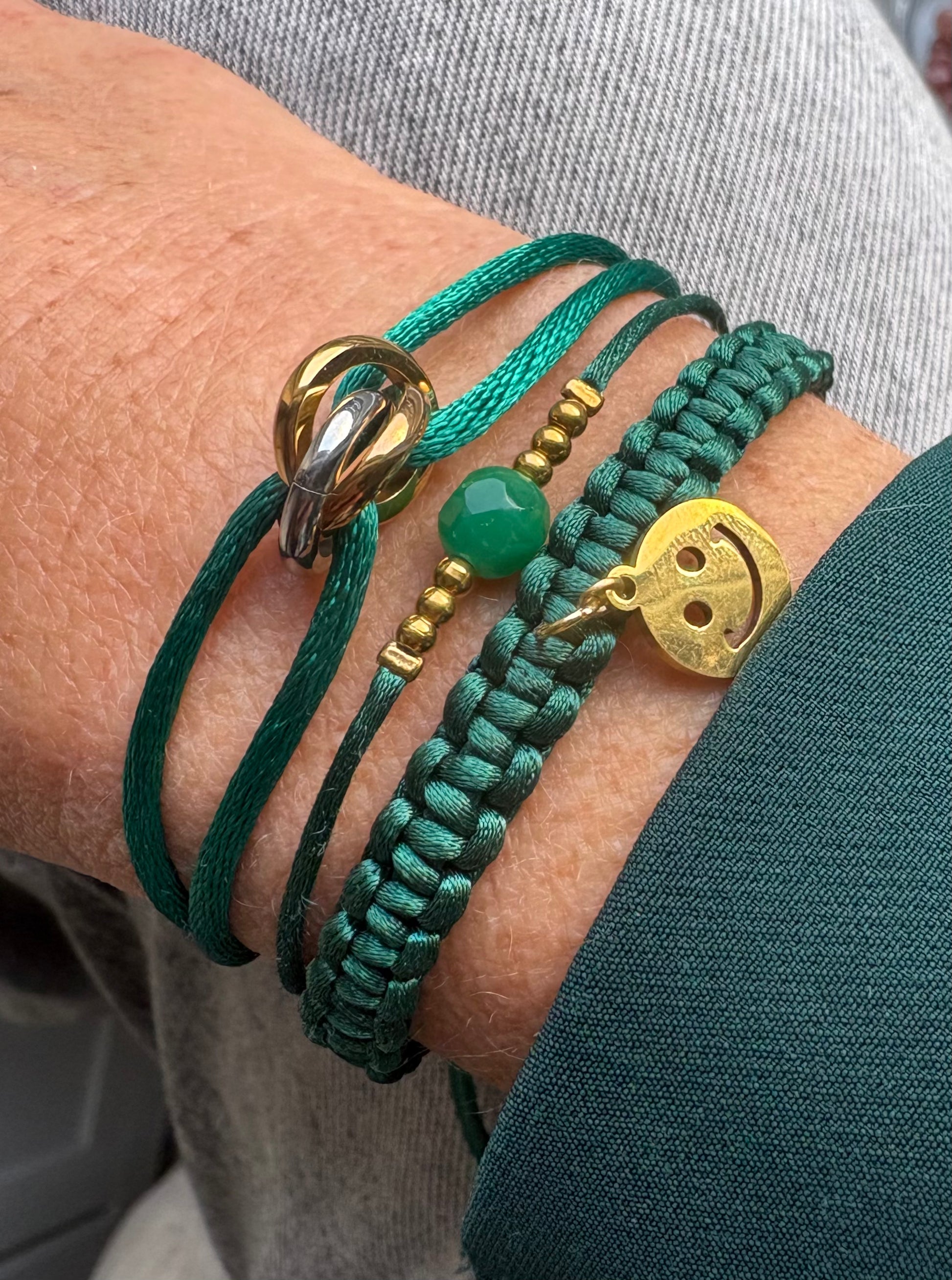 Armbandje met emerald kleurig steentje en stainless steel gouden details. Lengte is ong. 15,5cm + 3cm.