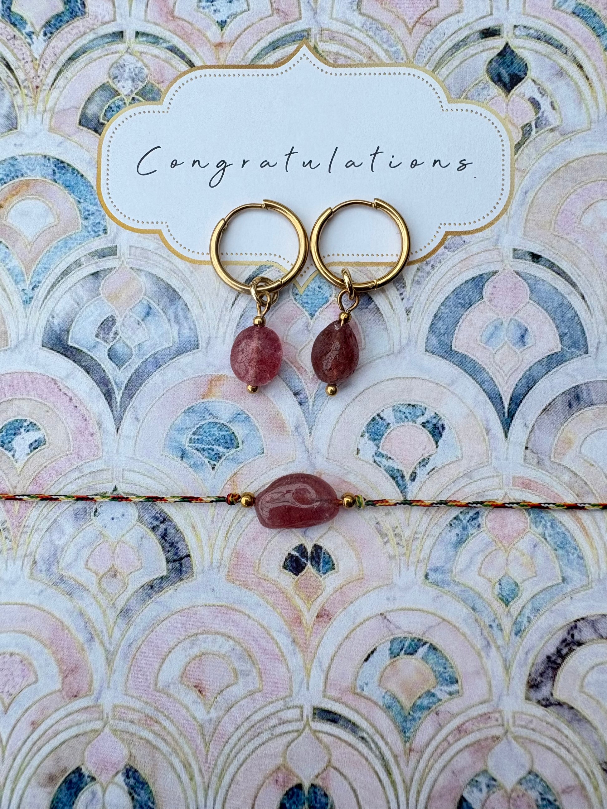 Setje stainless steel gouden oorbellen met bijpassend armbandje - aardbeienkwarts steentjes. One size fits all.