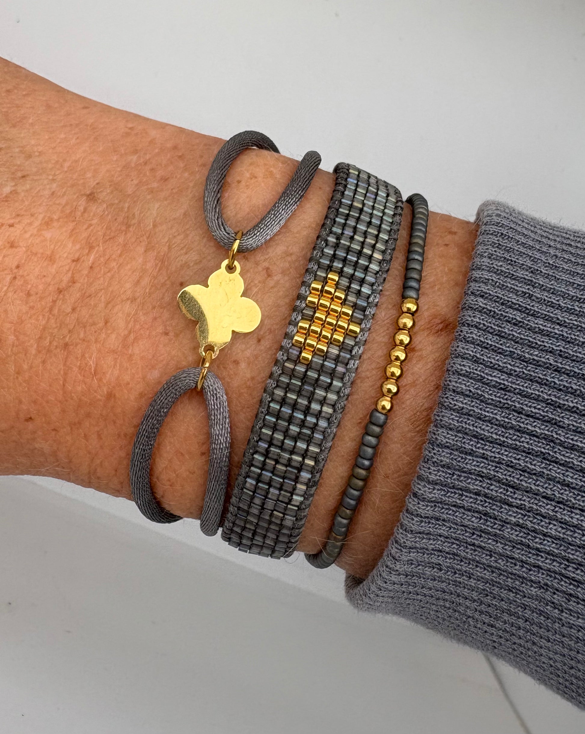 Set van 3 armbandjes, in mooie grijze kleur, handmade by Smiek. Verstelbaar d.m.v. schuifknoopjes. Set is geschikt voor de gemiddelde pols.
