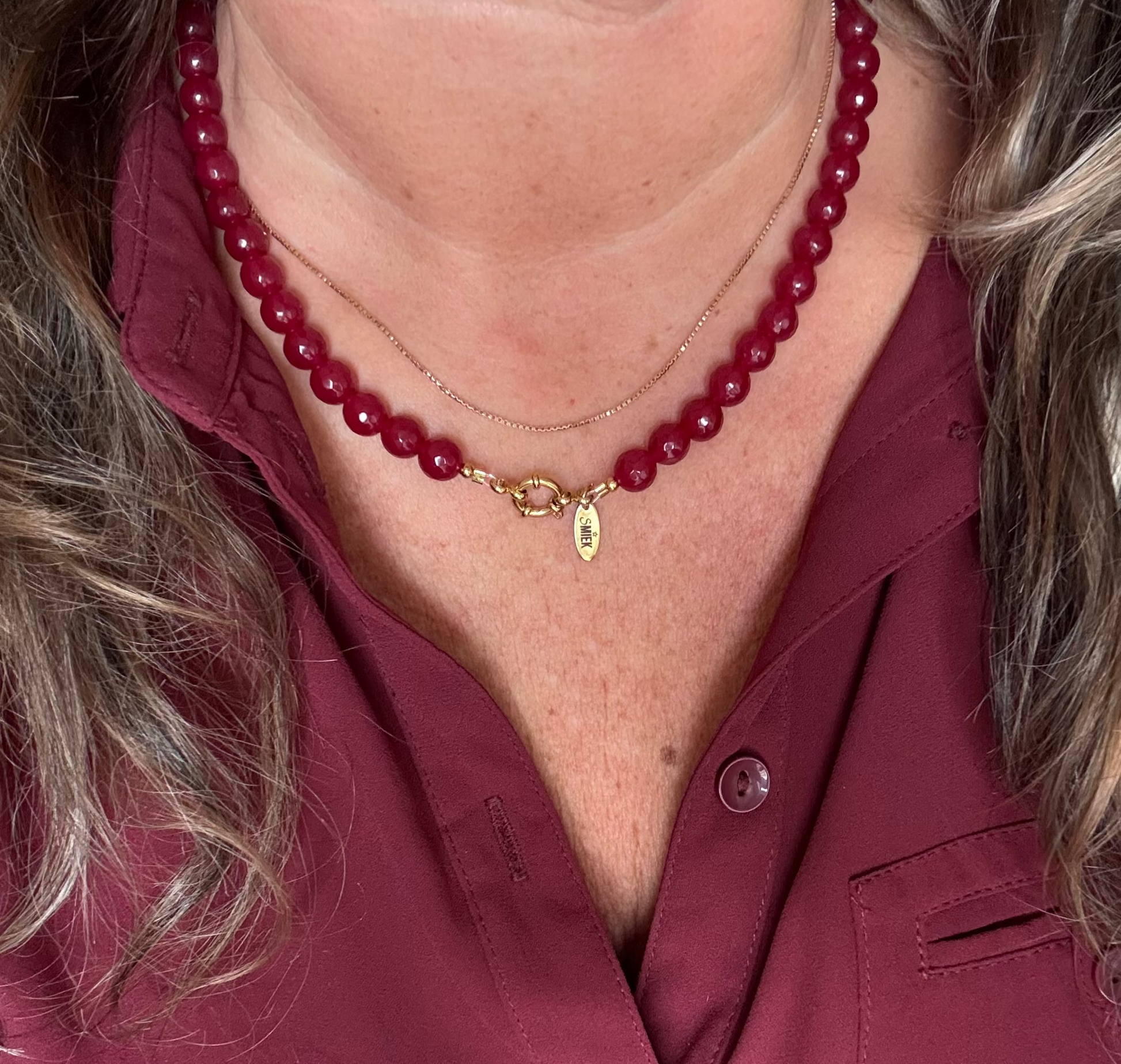 Ketting met 8mm bordeaux-kleurige halfedelsteen kralen (agaat) en stainless steel gouden boeislot. Lengte is ong. 43cm.