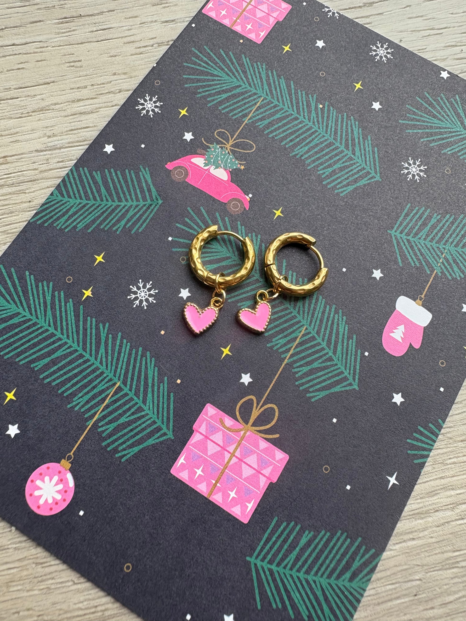 Stainless steel gouden oorbellen met roze hartjes. Grootte ringetjes is ong. 15mm en ze zijn 2,5mm dik.