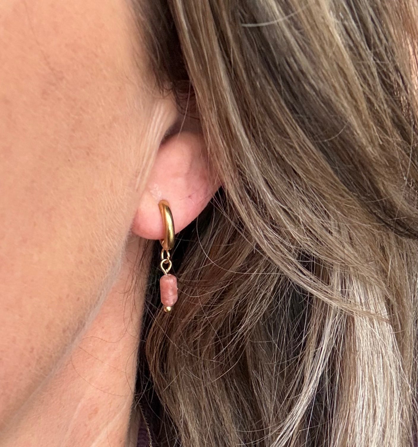 Setje stainless steel oorringetjes met roze natuursteentjes. Het zijn kleine oorringetjes : ong. 11mm en dikte ong.2mm.