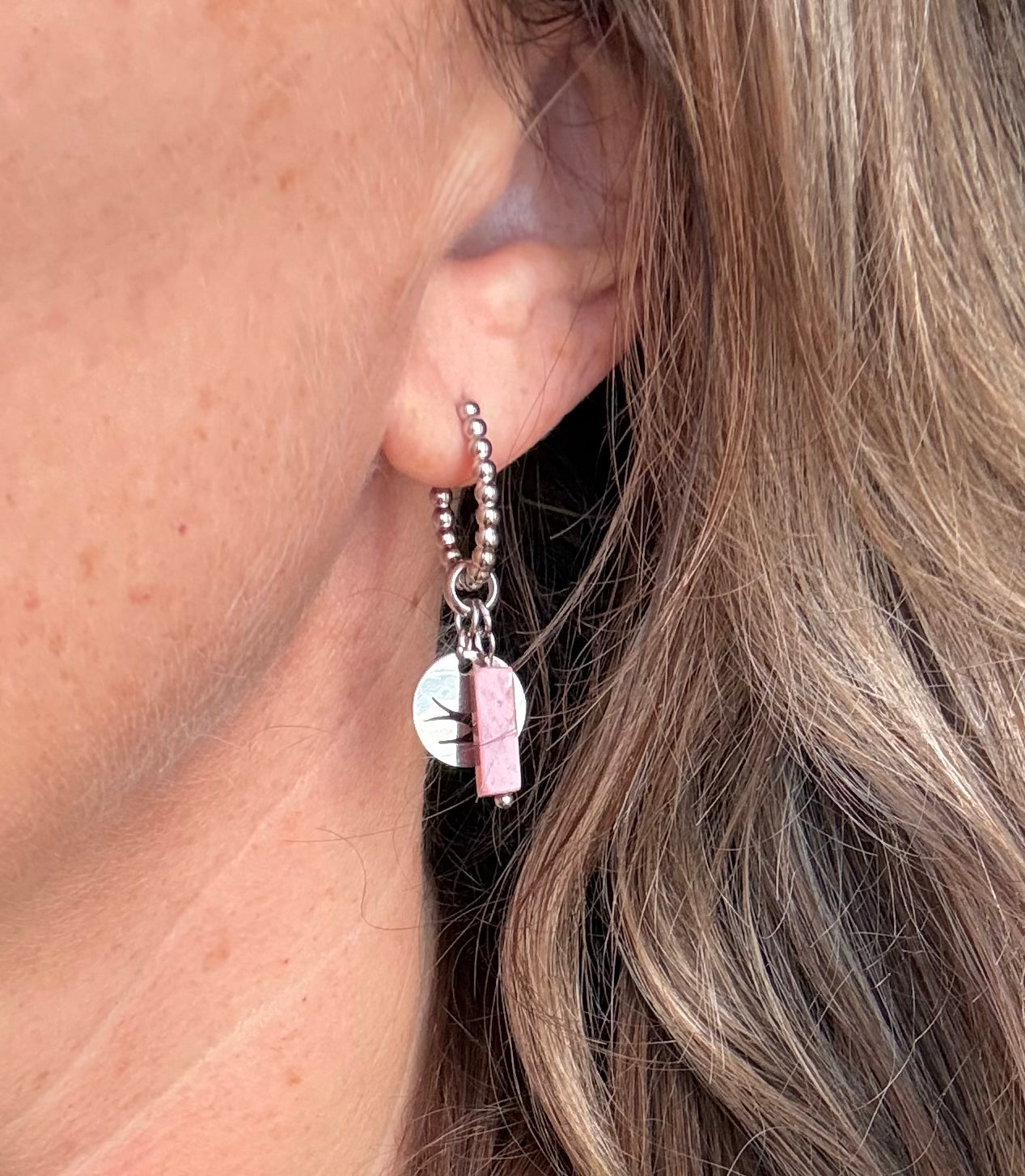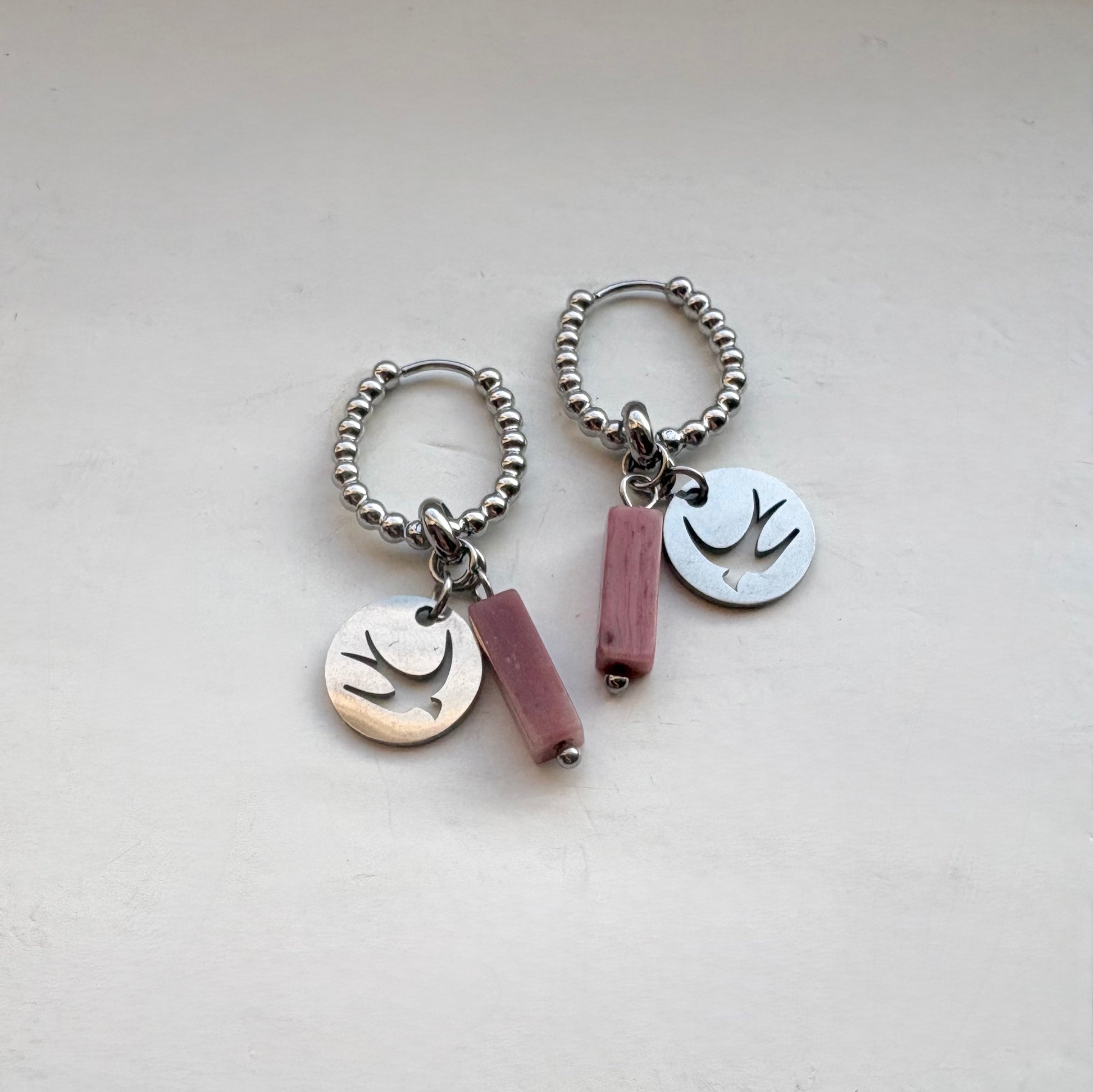 Stainless steel zilveren oorbellen met zwaluw bedels & rhodoniet staafjes.