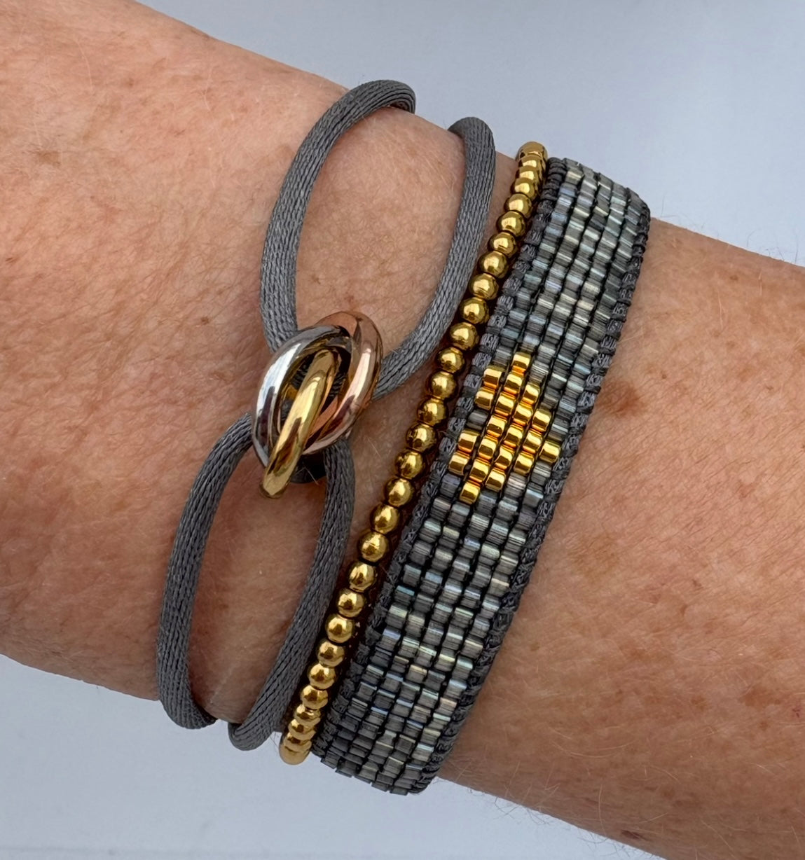 Armbandje met 3 tricolore rvs (stalen) ringetjes, keuze in kleur satijn. Schakel blijft mooi na douchen, zwemmen etc. Op maat te stellen door schuifknoopjes.