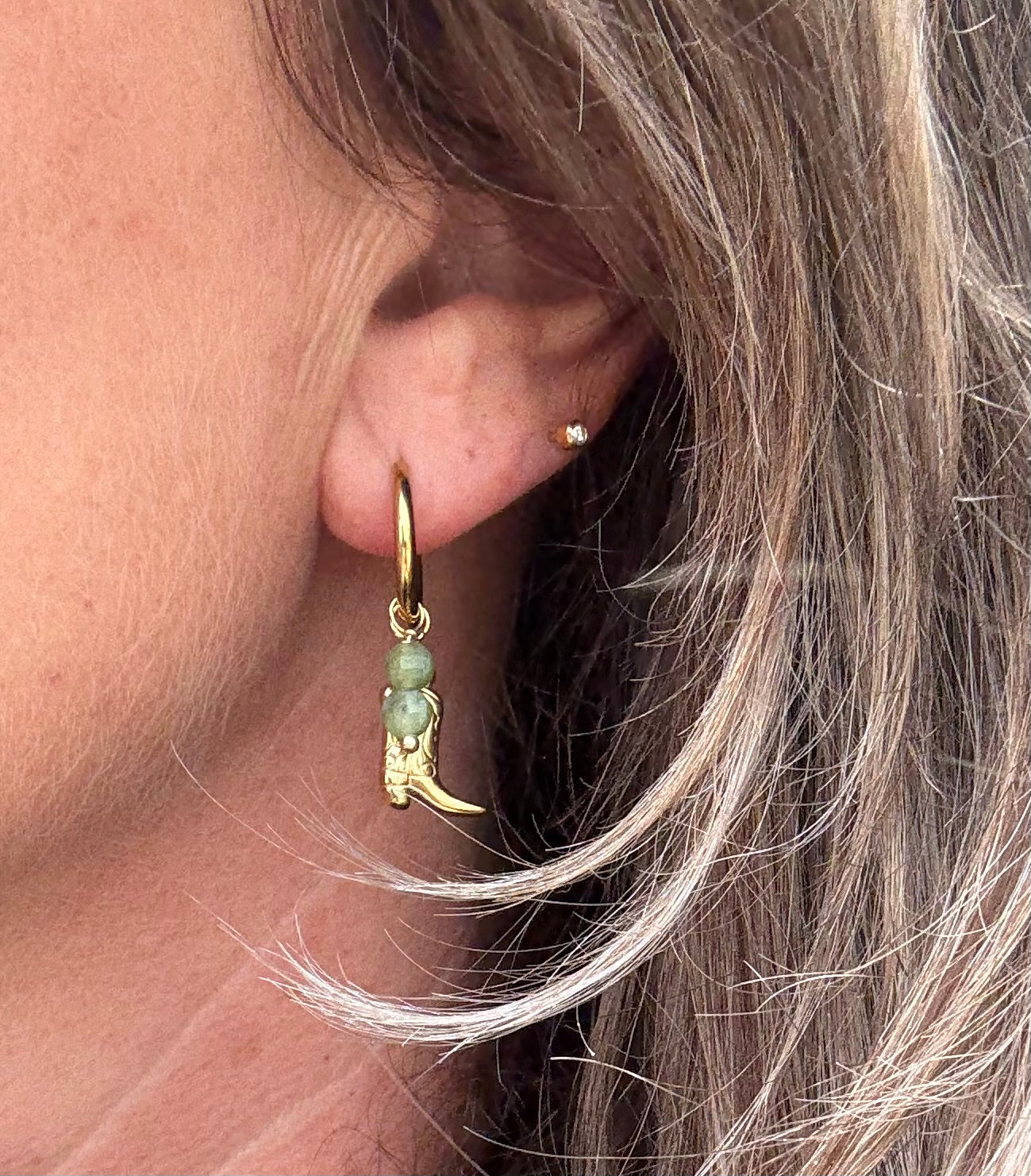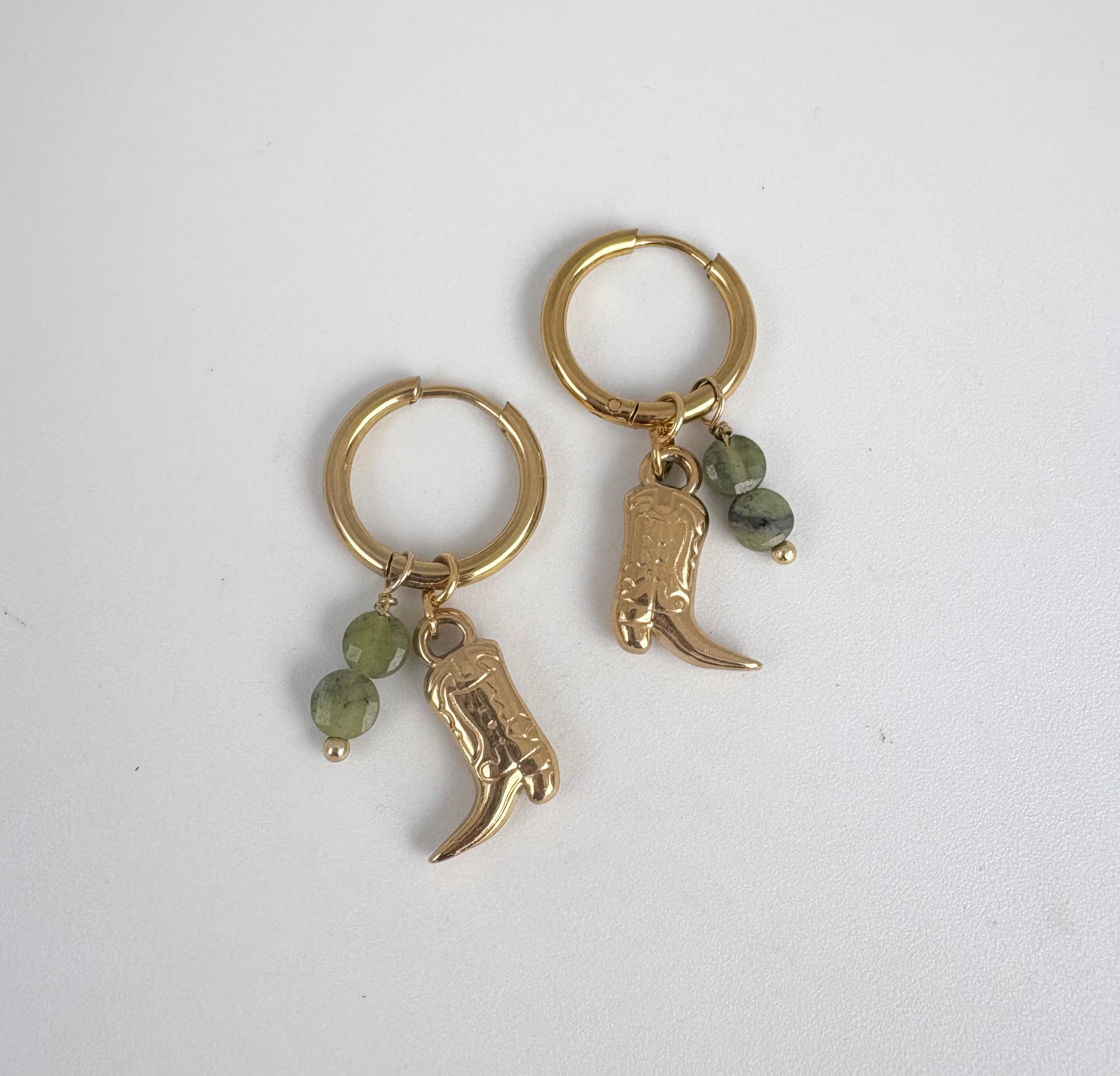 Setje stainless steel gouden oorbellen met laars bedels en olijf kleurige steentjes.